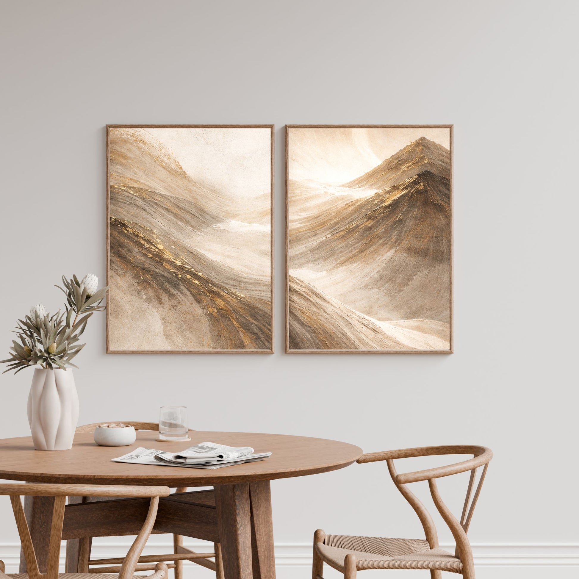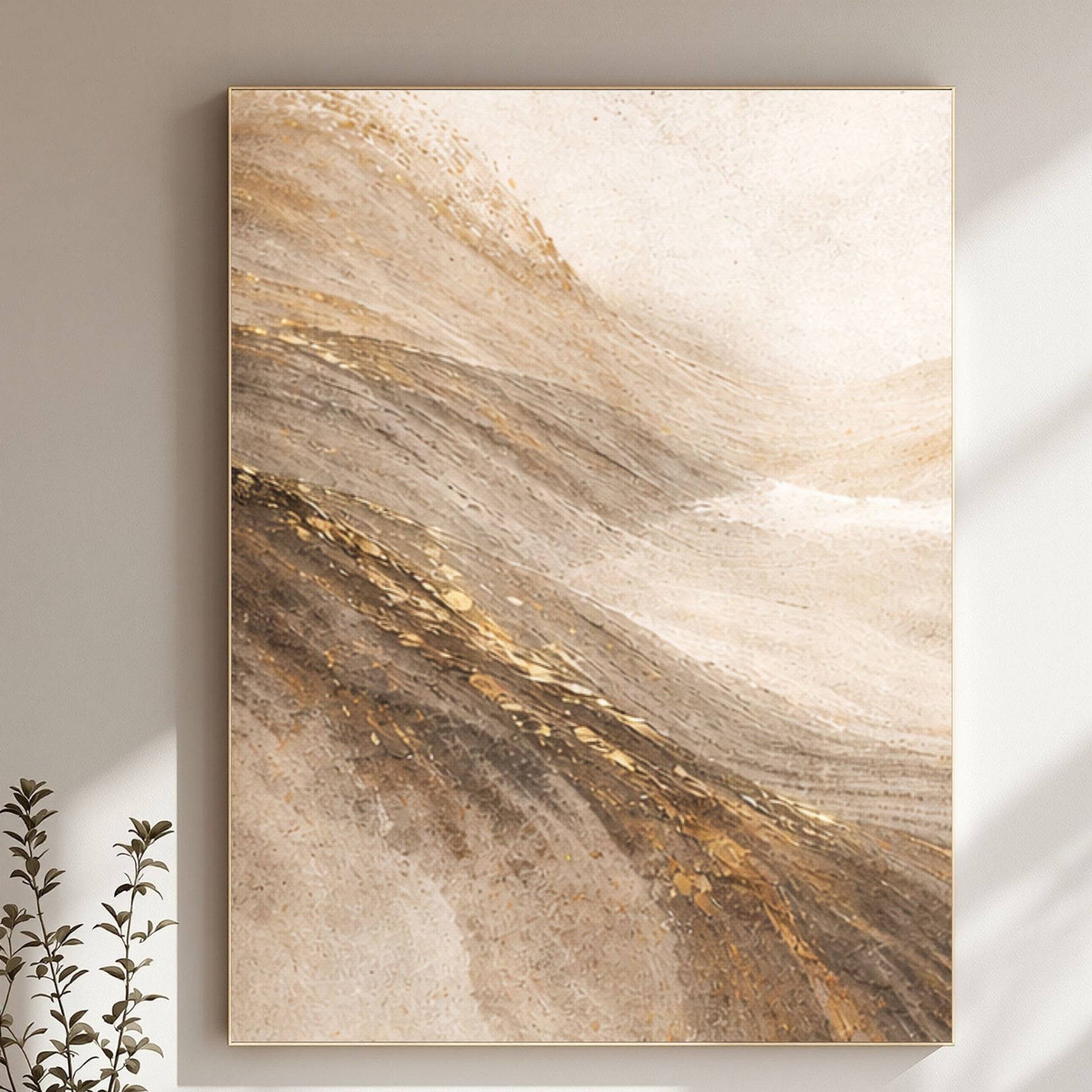 Layered brush strokes and soft tonal transitions in beige, sand, taupe and subtle gold accents create depth and dimension, bringing a sense of calm sophistication to any space.